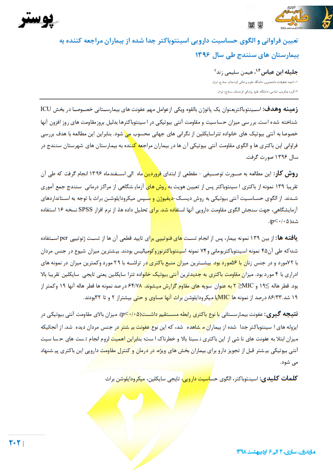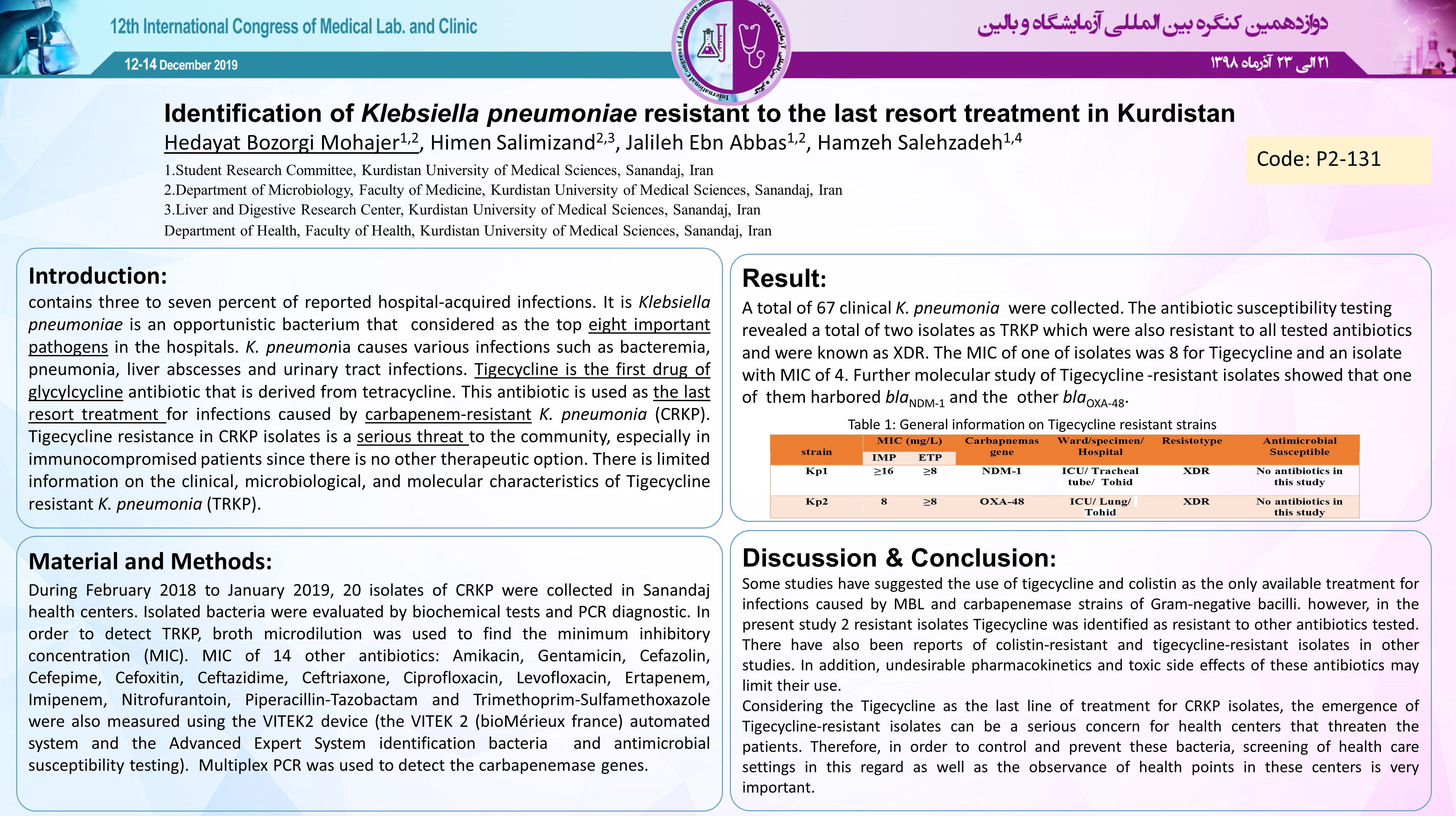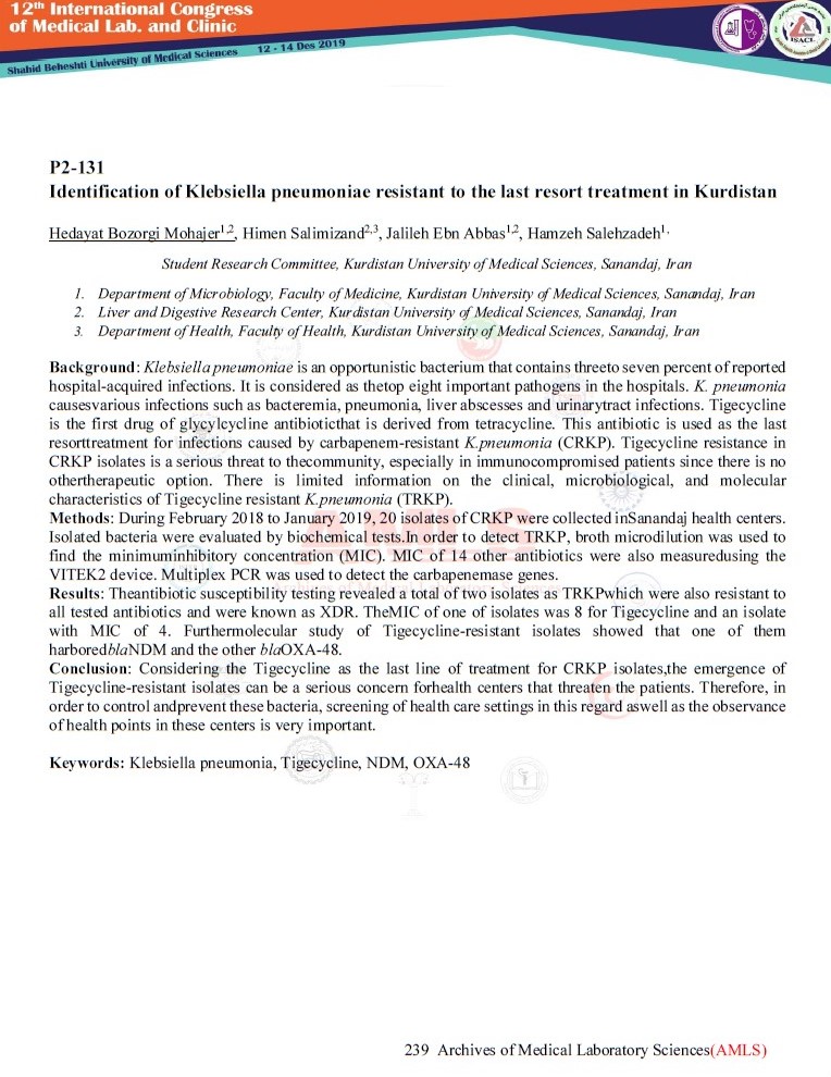 Title of Thesis: Evaluation of efflux pumps expression in tigecycline-resistant Acinetobacter baumannii isolates from Sanandaj University-Medical centers during 2017.